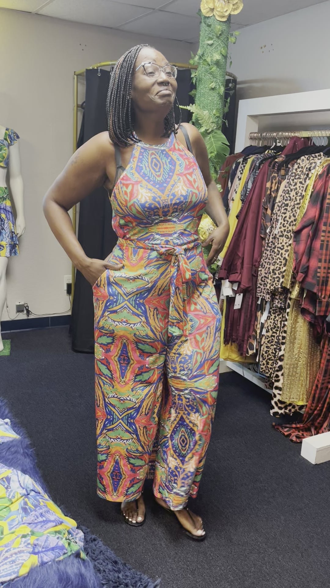 Printed Jumpsuit has a zipper midback and buttons at the top of the neck, comes with a waist tie belt , has pockets and is made of Cotton /Polyester Fabric.